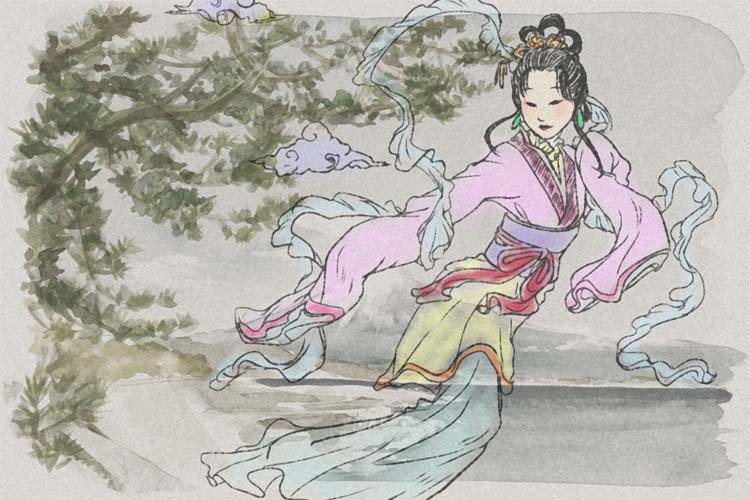 ・織女は西王母(中国の伝説的女神)に可愛がられた天界の機織りの天女であり、天の川の東岸に暮らし日々妙なる織物を紡いでいたが、ある日ふとした気晴らしから地上界の川辺に降りて水浴びをする。